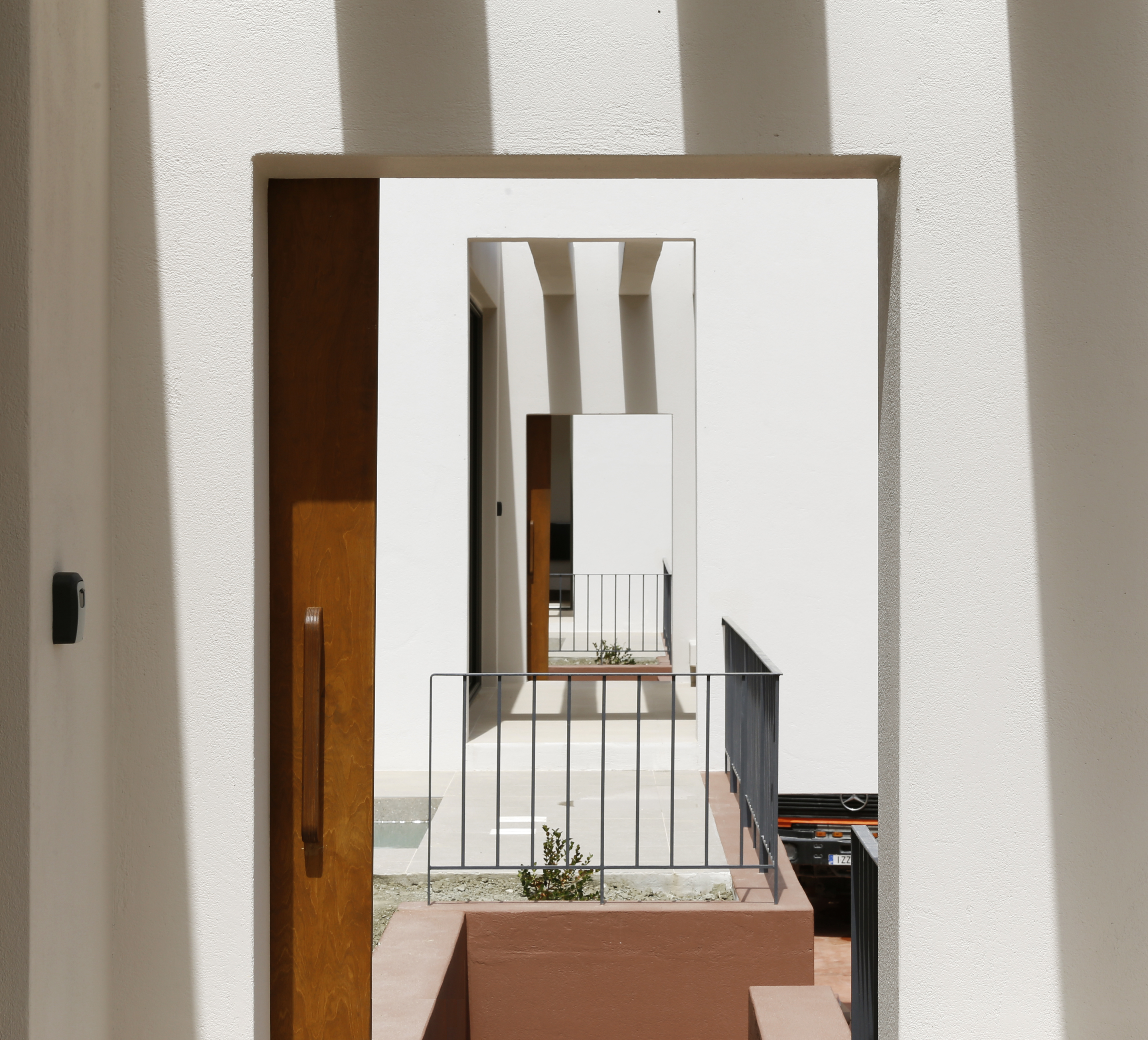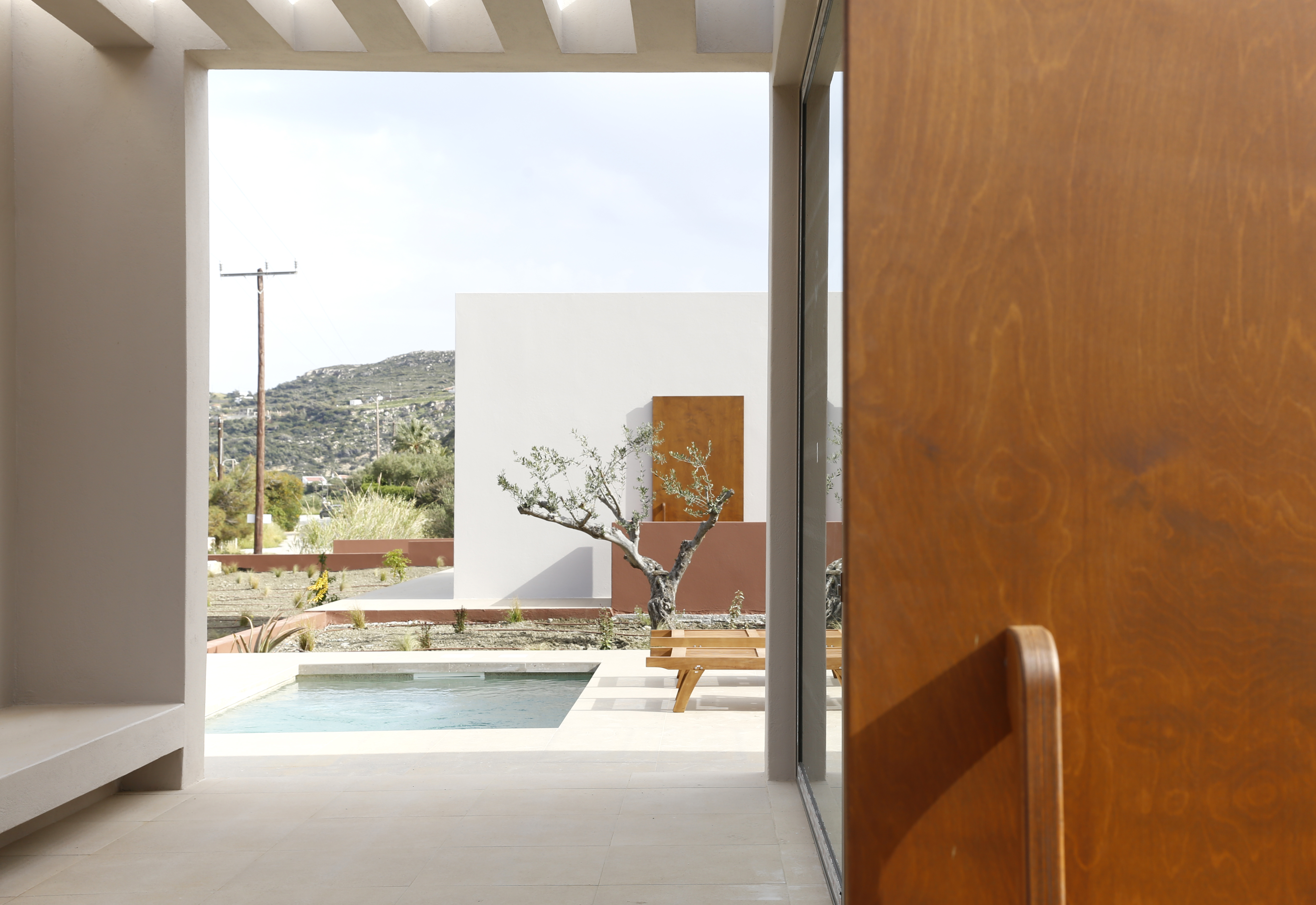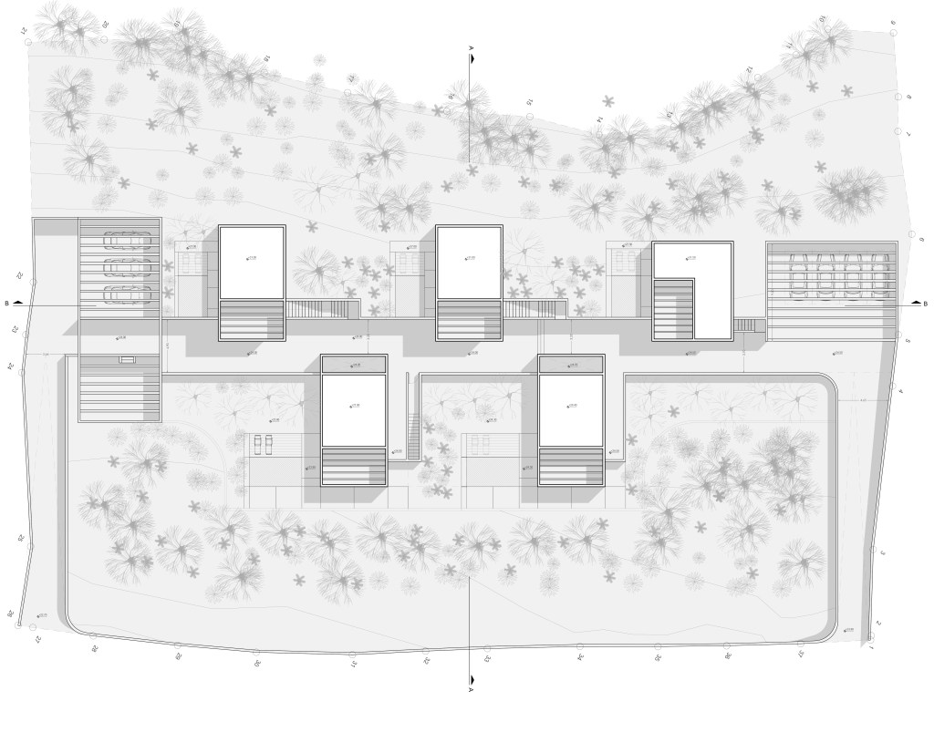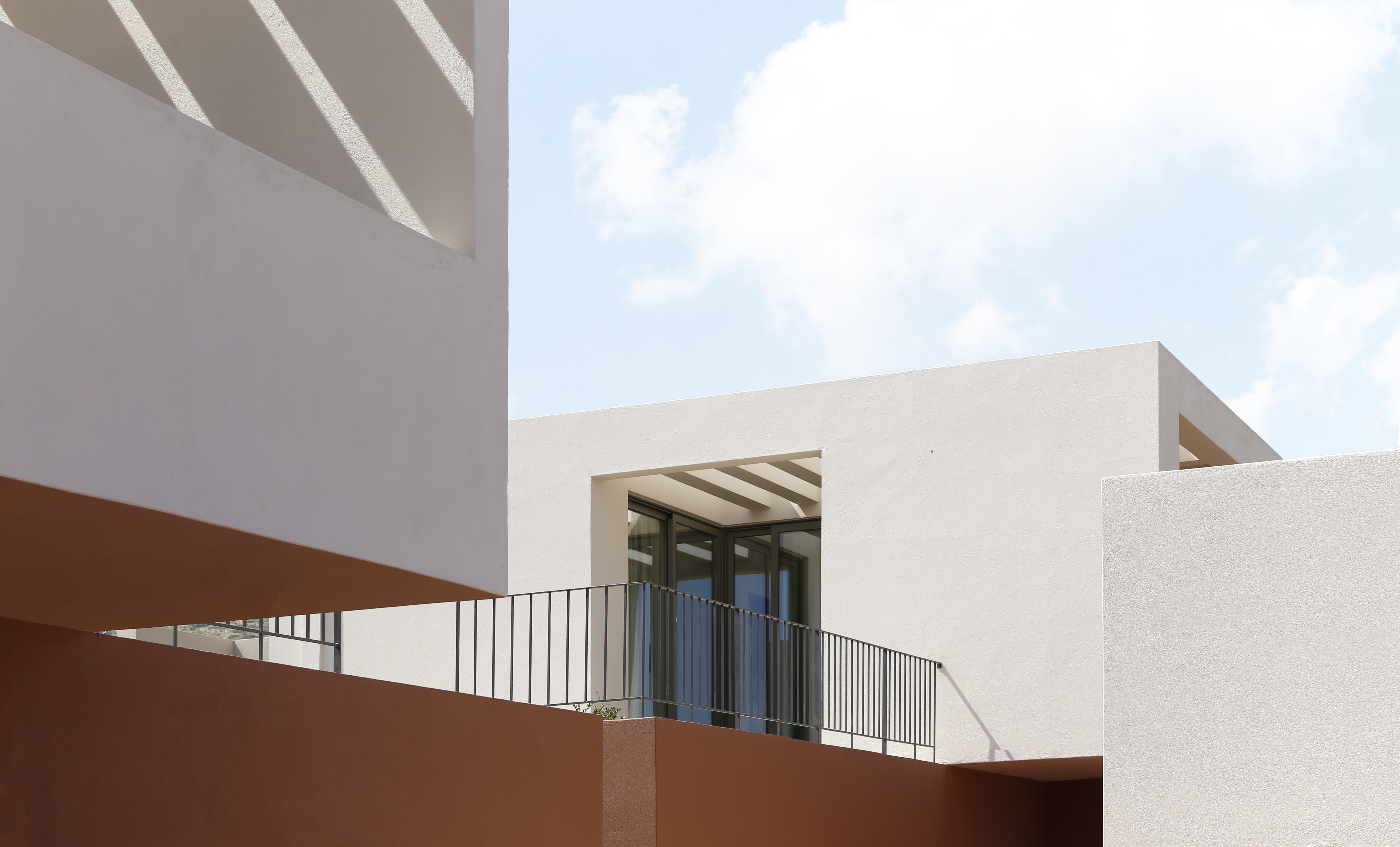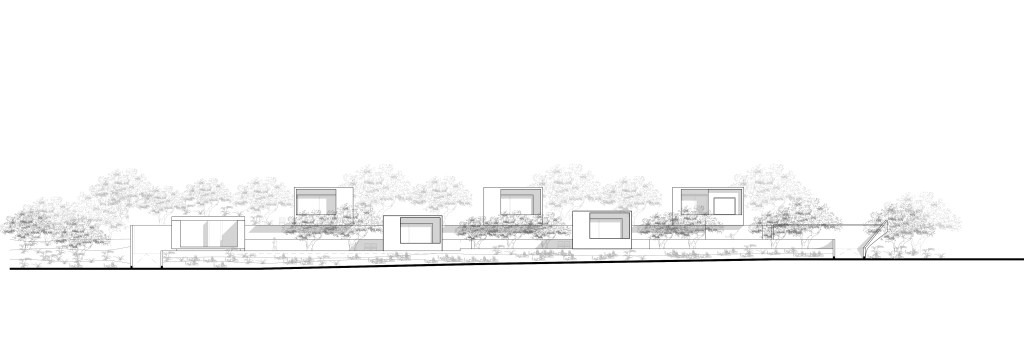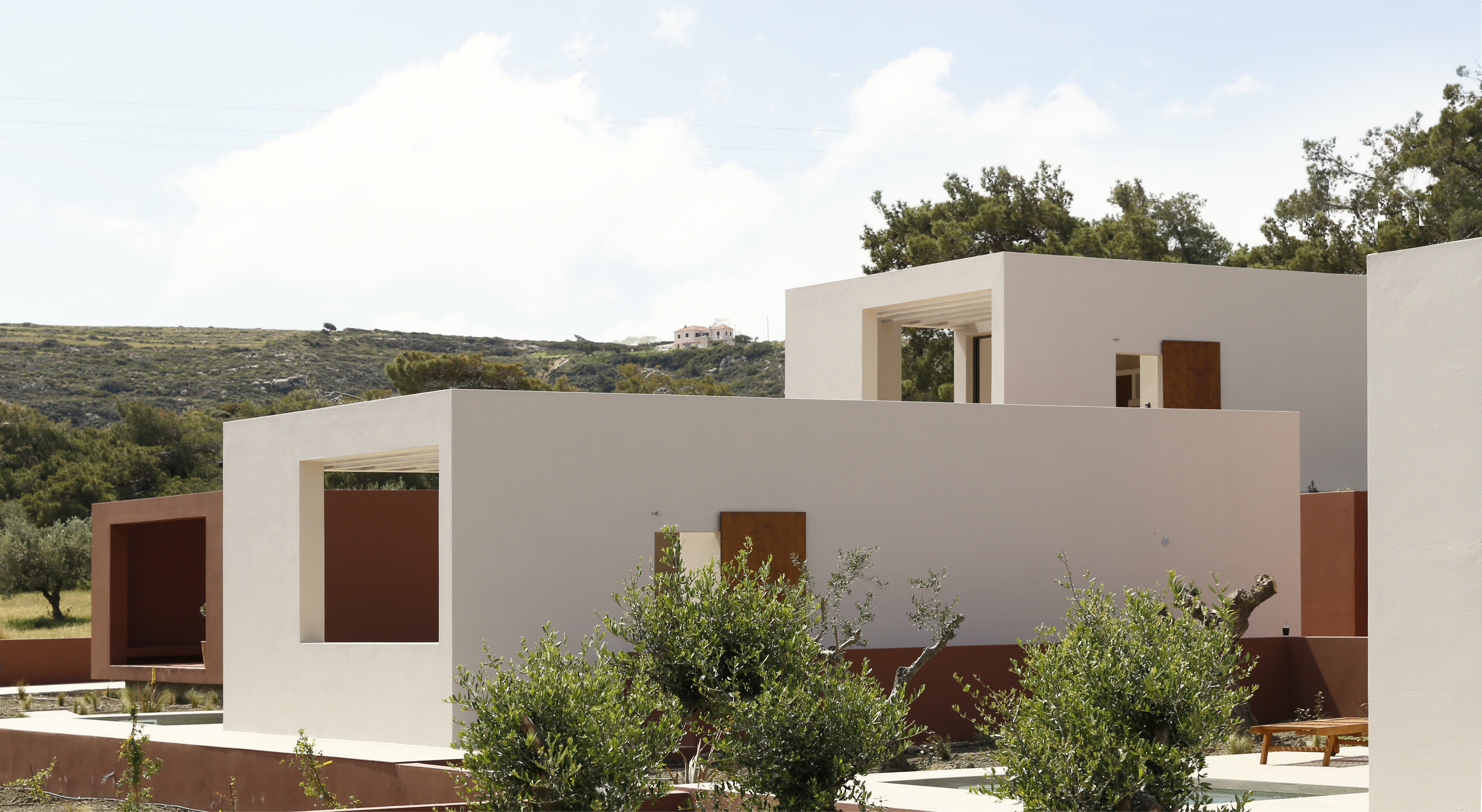 FLOATING CUBES / concept The project regards the construction of five vacation homes located on the island of Karpathos, Greece. The main intention was to divide the building into five distinct cubes that blend in with their surroundings. This would enable the houses to blur the boundaries between natural-artificial, private-public, and interior-exterior. To reinforce this intent, each individual cube house introduces three different space qualities that act as transitional thresholds from the interior to the exterior. The first space is a strictly private area and contains the essential facilities of a home: sleeping, eating and bathing. The second space, the courtyard, was designed to extend the first and forms the transition between the private part of the dwelling and the exterior. The third space surrounds the house and encloses the swimming pool. The residences are interconnected by a central corridor that links each unit individually. The purpose of the corridor is dual: on the one hand, it establishes the access routes to the dwellings and, on the other hand, it acts as a means for creating a variation in elevation among the blocks in harmony with the natural slope of the terrain to allow the rear dwellings to overlook the sea. On the back side of the houses a patio was created which allows natural sunlight to stream into the bathroom and kitchen while still providing a certain level of privacy. In addition, the client wished to include a shared social space with an outdoor lounge, kitchen and dining area. To preserve the privacy of the homes, this space was not designed as a void but as a full space. However, in order to maintain its public character, the structure was constructed with the same materials as the shared central corridor.