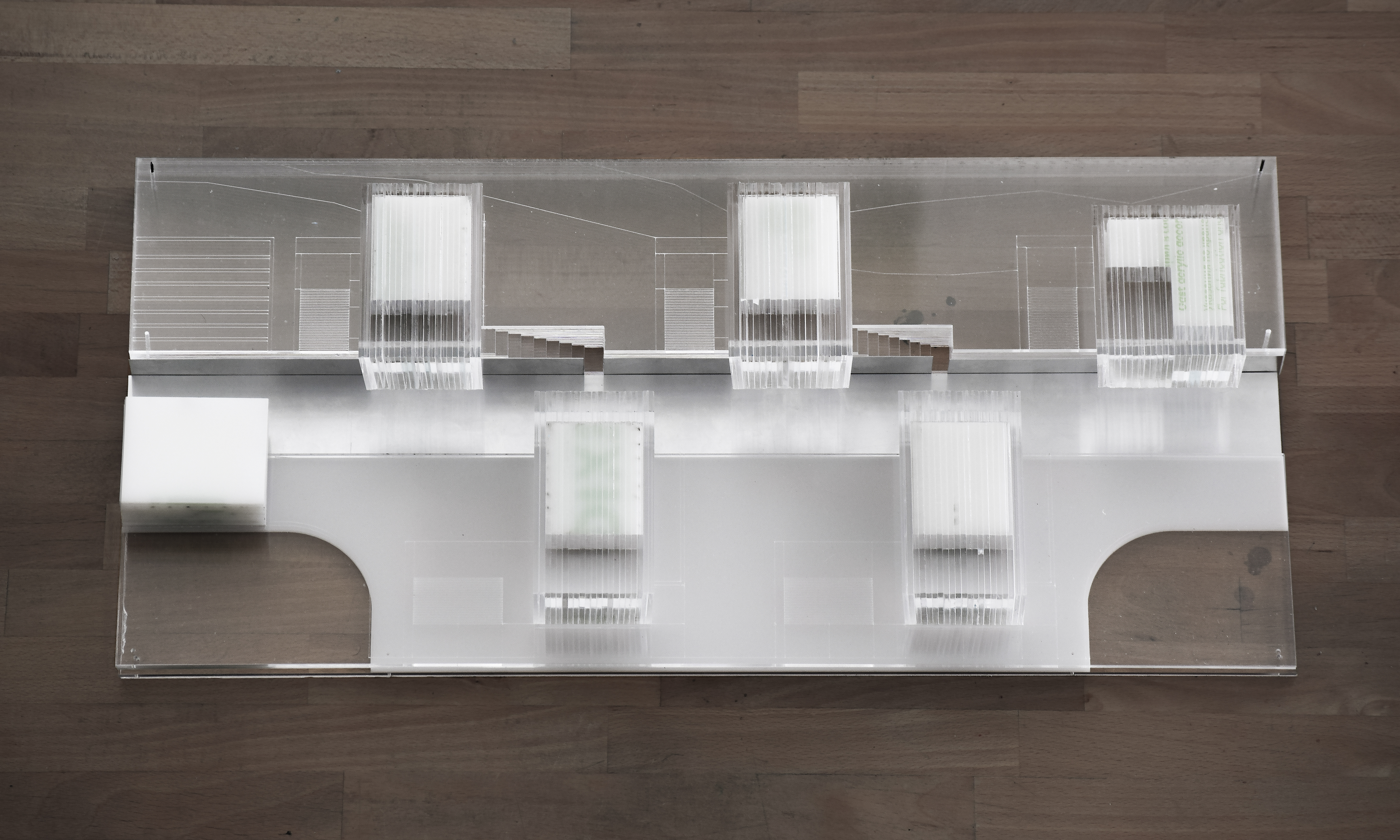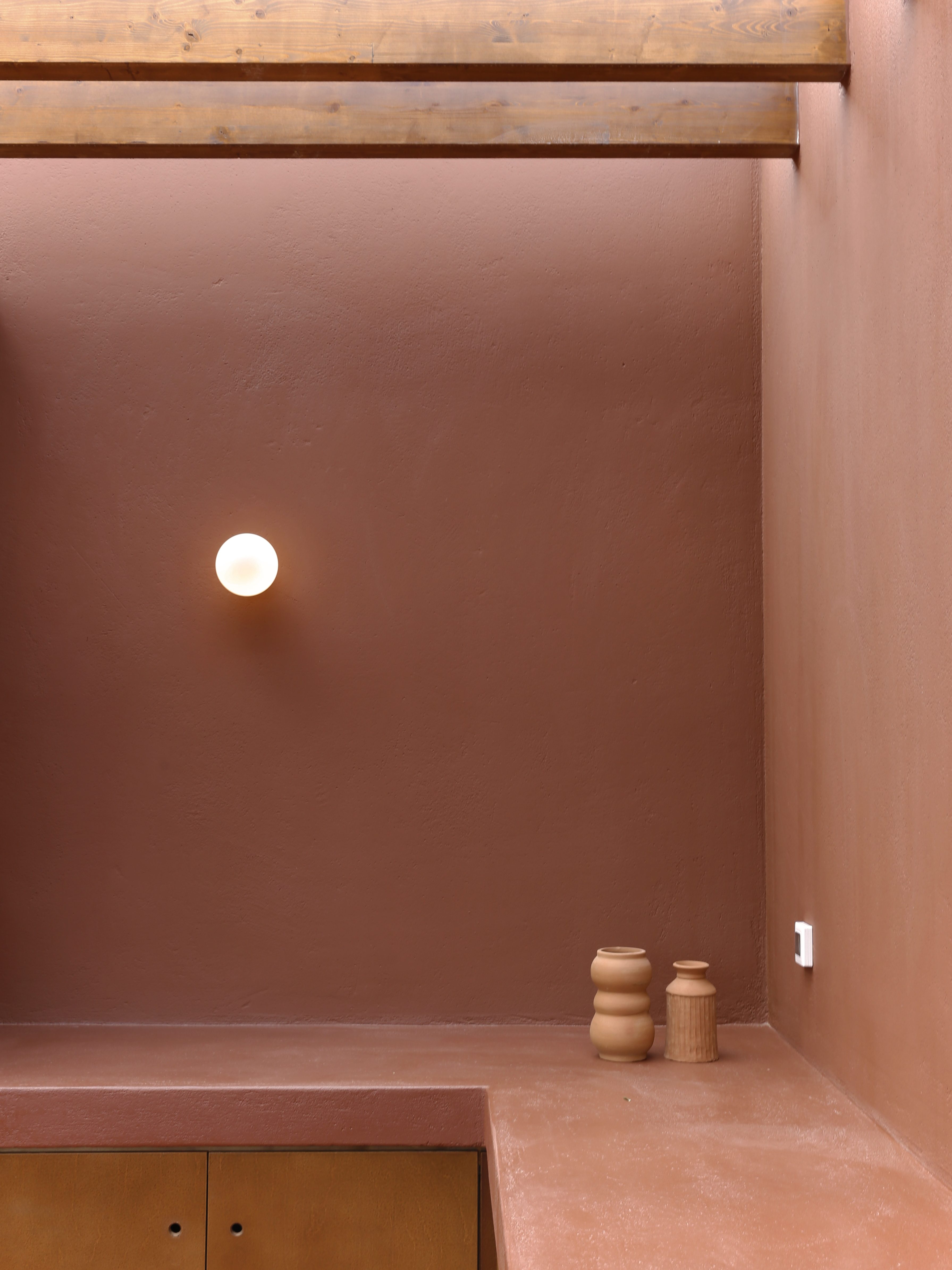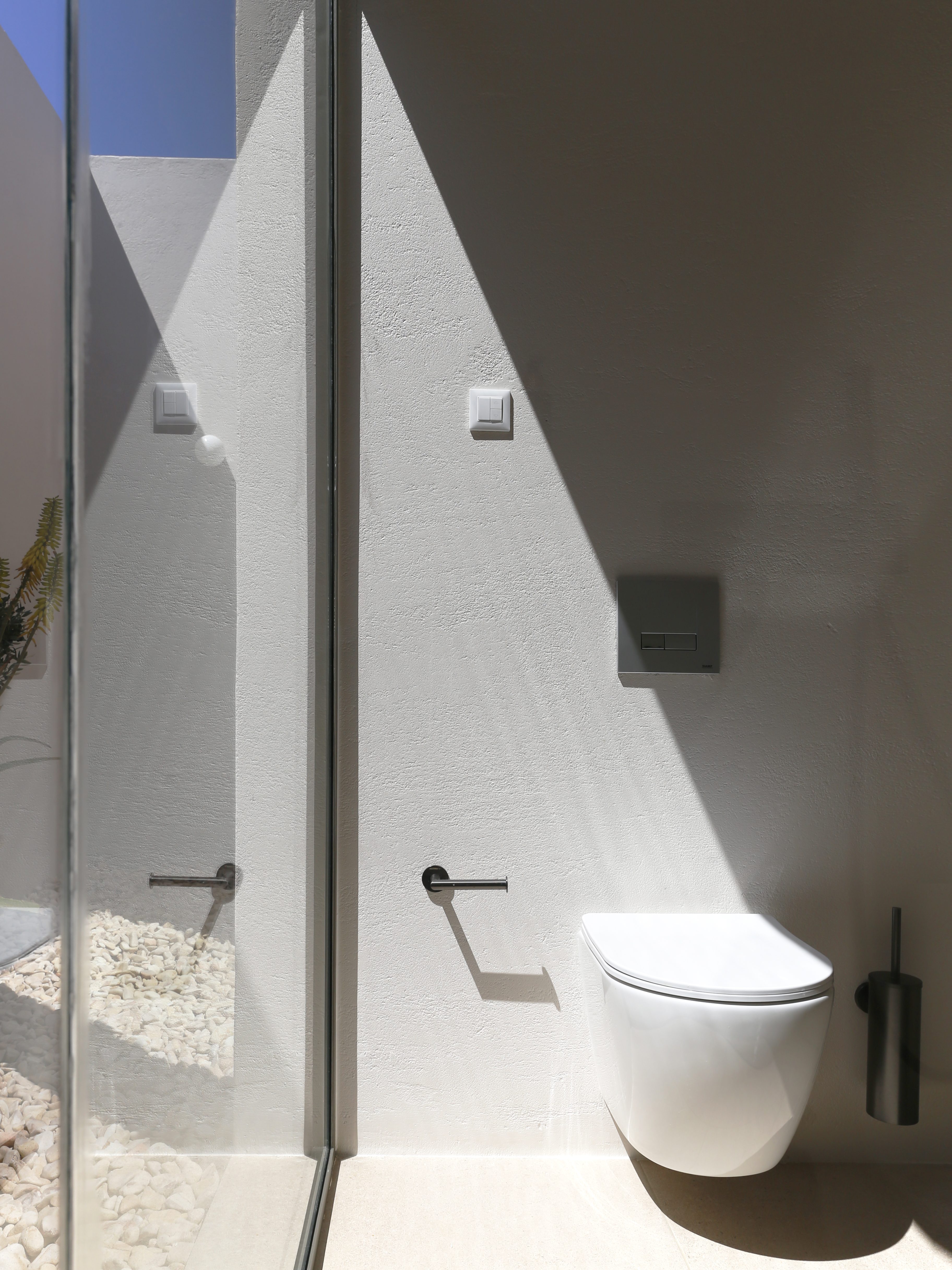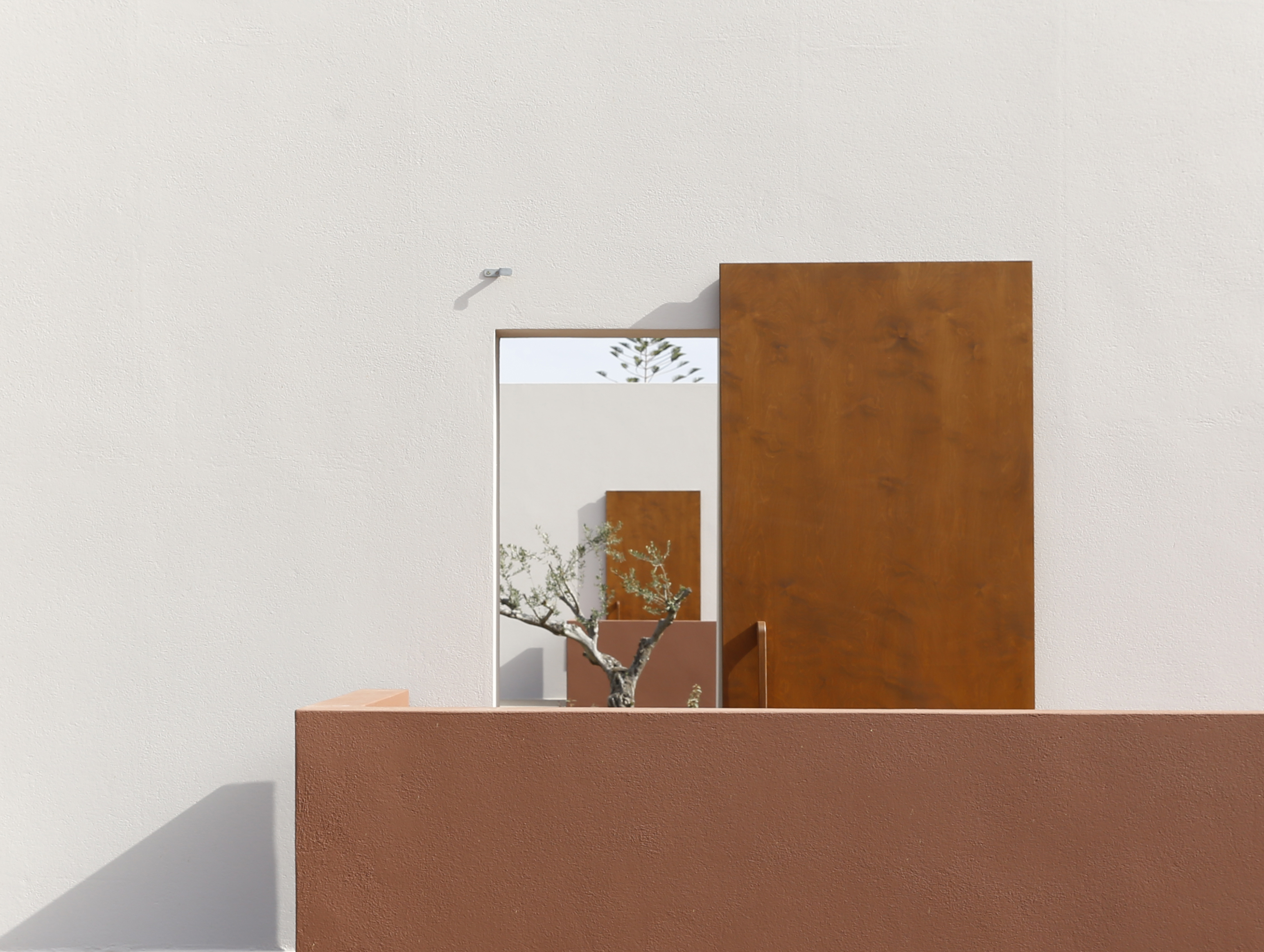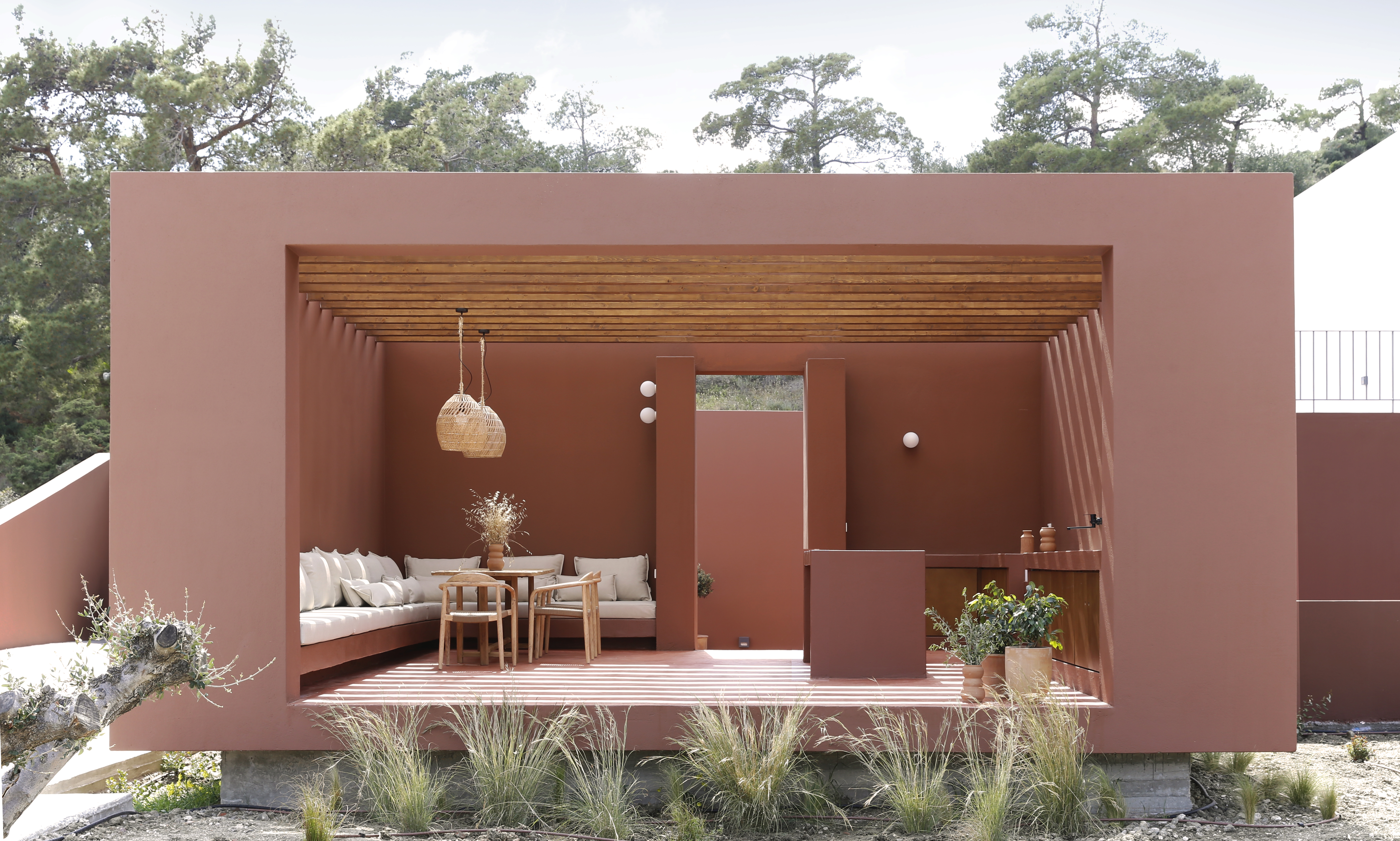 FLOATING CUBES / concept The project regards the construction of five vacation homes located on the island of Karpathos, Greece. The main intention was to divide the building into five distinct cubes that blend in with their surroundings. This would enable the houses to blur the boundaries between natural-artificial, private-public, and interior-exterior. To reinforce this intent, each individual cube house introduces three different space qualities that act as transitional thresholds from the interior to the exterior. The first space is a strictly private area and contains the essential facilities of a home: sleeping, eating and bathing. The second space, the courtyard, was designed to extend the first and forms the transition between the private part of the dwelling and the exterior. The third space surrounds the house and encloses the swimming pool. The residences are interconnected by a central corridor that links each unit individually. The purpose of the corridor is dual: on the one hand, it establishes the access routes to the dwellings and, on the other hand, it acts as a means for creating a variation in elevation among the blocks in harmony with the natural slope of the terrain to allow the rear dwellings to overlook the sea. On the back side of the houses a patio was created which allows natural sunlight to stream into the bathroom and kitchen while still providing a certain level of privacy. In addition, the client wished to include a shared social space with an outdoor lounge, kitchen and dining area. To preserve the privacy of the homes, this space was not designed as a void but as a full space. However, in order to maintain its public character, the structure was constructed with the same materials as the shared central corridor.
